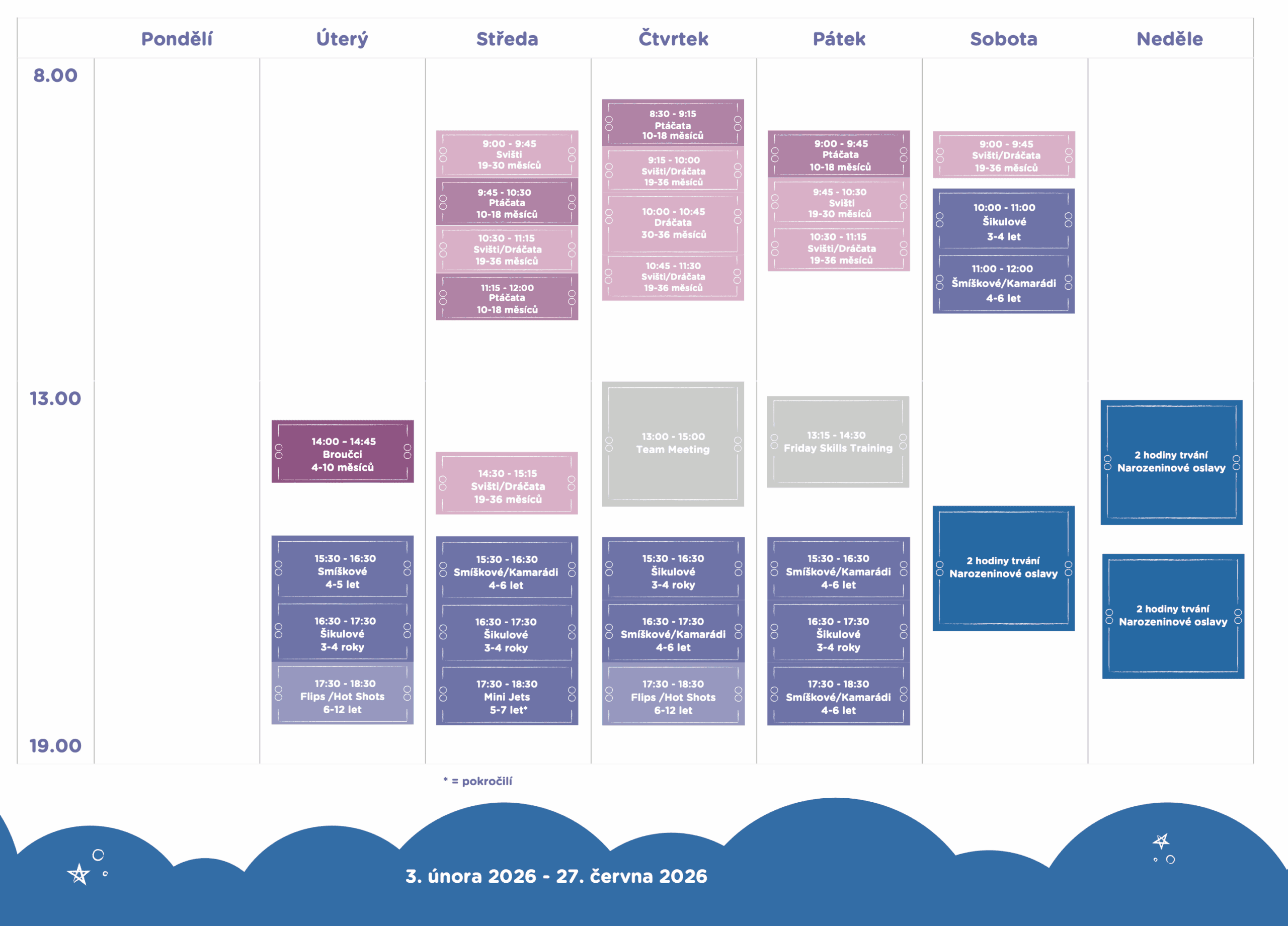 Po jeho uhrazení získává vaše rodina nárok na slevy na dětské narozeninové oslavy, prázdninové programy i speciální akce. Zároveň budete mít přednostní přístup k informacím o plánovaných událostech a výjimečných nabídkách – a také možnost přihlásit se přednostně do kurzů ve vámi vybraných časech.